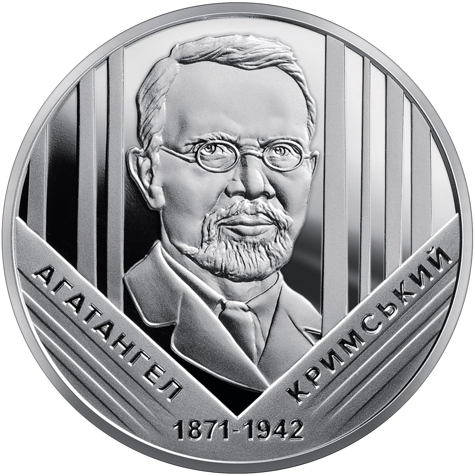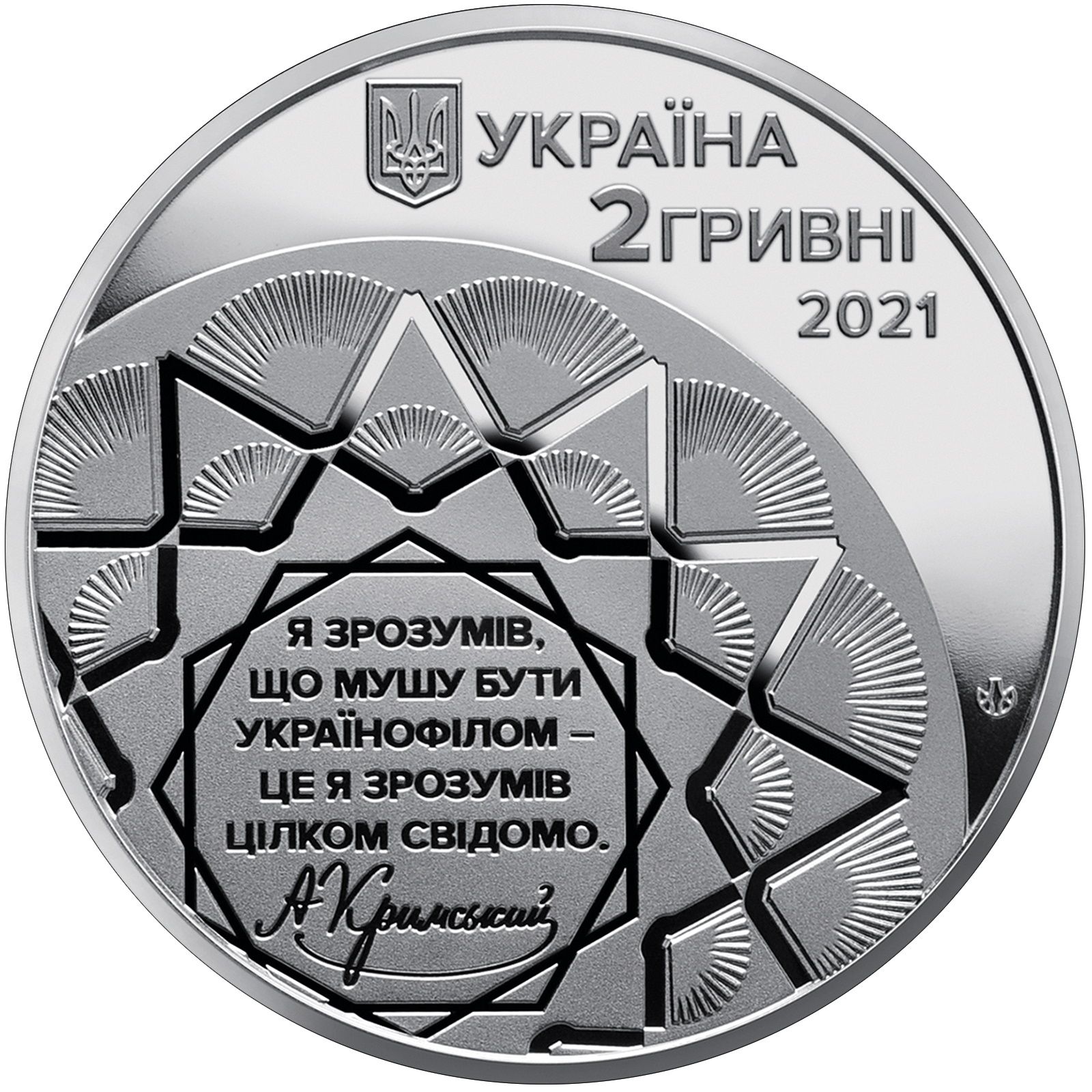 Опис: Зверху зображено малий герб України, праворуч від якого розміщено напис УКРАЇНА/2 ГРИВНІ/2021 (Україна/2 гривні/2021); є композиція, що символізує діяльність сходознавця та джерело його знань, яка складається з геометричного орнаменту з відкритих книг, що утворюють багатогранну зірку; у центрі зірки розміщені такі слова Кримського: Я ЗРОЗУМІВ,/ ЩО МУШУ БУТИ/ УКРАЇНОФІЛОМ –/ ЦЕ Я ЗРОЗУМІВ/ ЦІЛКОМ СВІДОМО (Я зрозумів, що мушу бути українофілом – це було цілком свідоме рішення); під цитатою – факсиміле А Кримський; нижче, праворуч – знак монетного двору ПБНБ «Банкнотно-монетний двір».