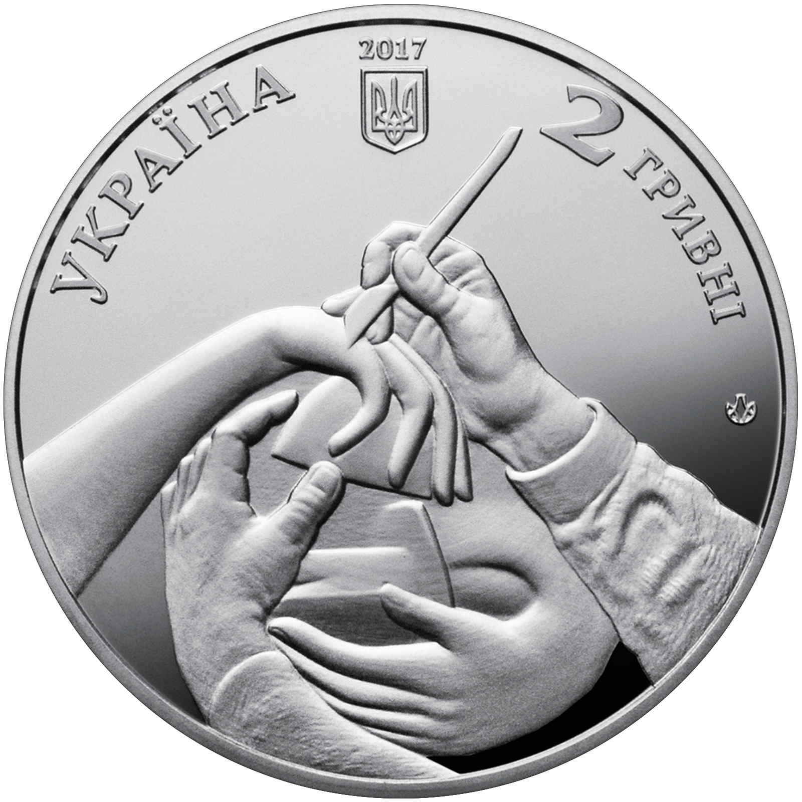 Опис: Зверху зображено малий герб України, під яким вказано рік випуску — 2017; ліворуч — напівкругла легенда «УКРАЇНА», праворуч — номінал монети — «2 ГРИВНІ», під яким розміщено знак монетного двору НБУ «Держдрукарня та монетний двір НБУ»; на гладкому тлі зображено стилізовану композицію, що зображає руки майстра, який ліпить скульптуру.