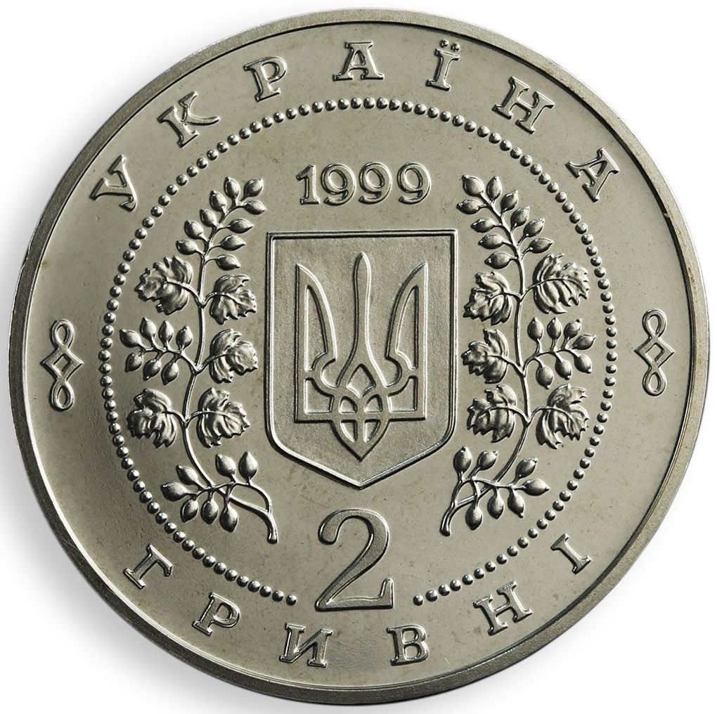 Опис: У центрі орнаменту по колу монети розміщено невеликий герб України в обрамленні гілочок журавлини та написів: УКРАЇНА, 2 ГРИВНІ, 1999 (Україна/ 2 /гривні/ 1999).