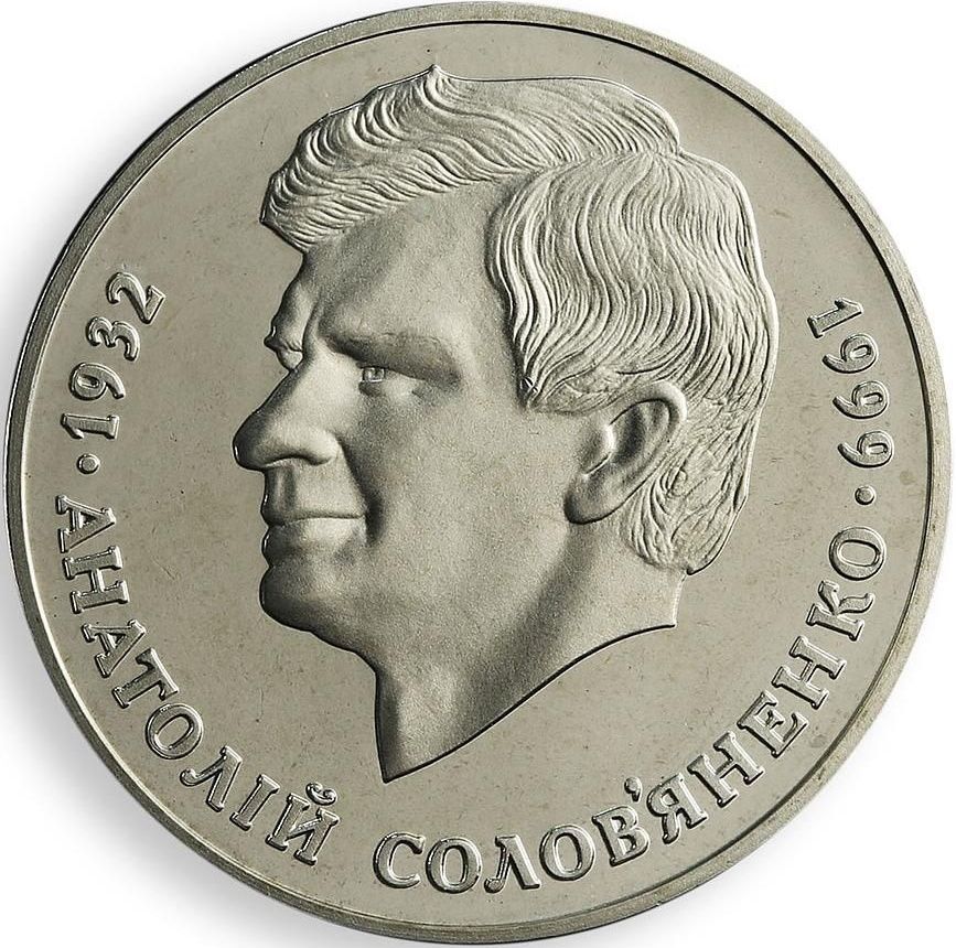 Опис: На монеті зображено профільний портрет співака. По колу монети розміщено напис: АНАТОЛІЙ СОЛОВ`ЯНЕНКО, (Анатолій Солов'яненко), 1932-1999.