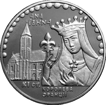 Опис: На монеті зображено стилізоване зображення Анни як королеви Франції на тлі церкви абатства Сент-Вінсент.