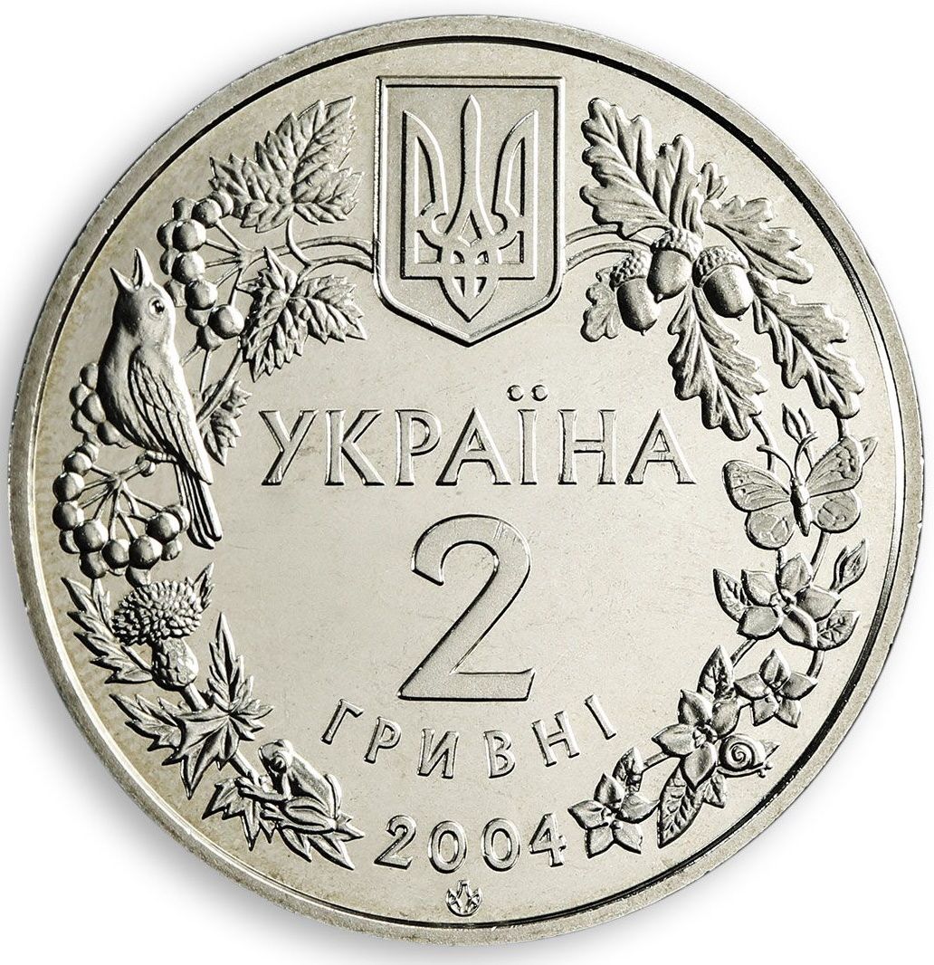 Опис: У вінку з зображень рослин і тварин вигравірувано малий герб України та напис: УКРАЇНА, 2, ГРИВНІ, 2004 (Україна/ 2/ гривні/ 2004), а також зображено логотип Монетного двору НБУ.