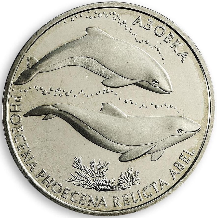 Опис: На монеті зображено двох азовських дельфінів з бульбашками повітря у воді, а нижче — водорості та кругові написи: АЗОВКА (Азовський дельфін) (праворуч) та PHOECENA PHOECENA RELICTA ABEL (ліворуч).