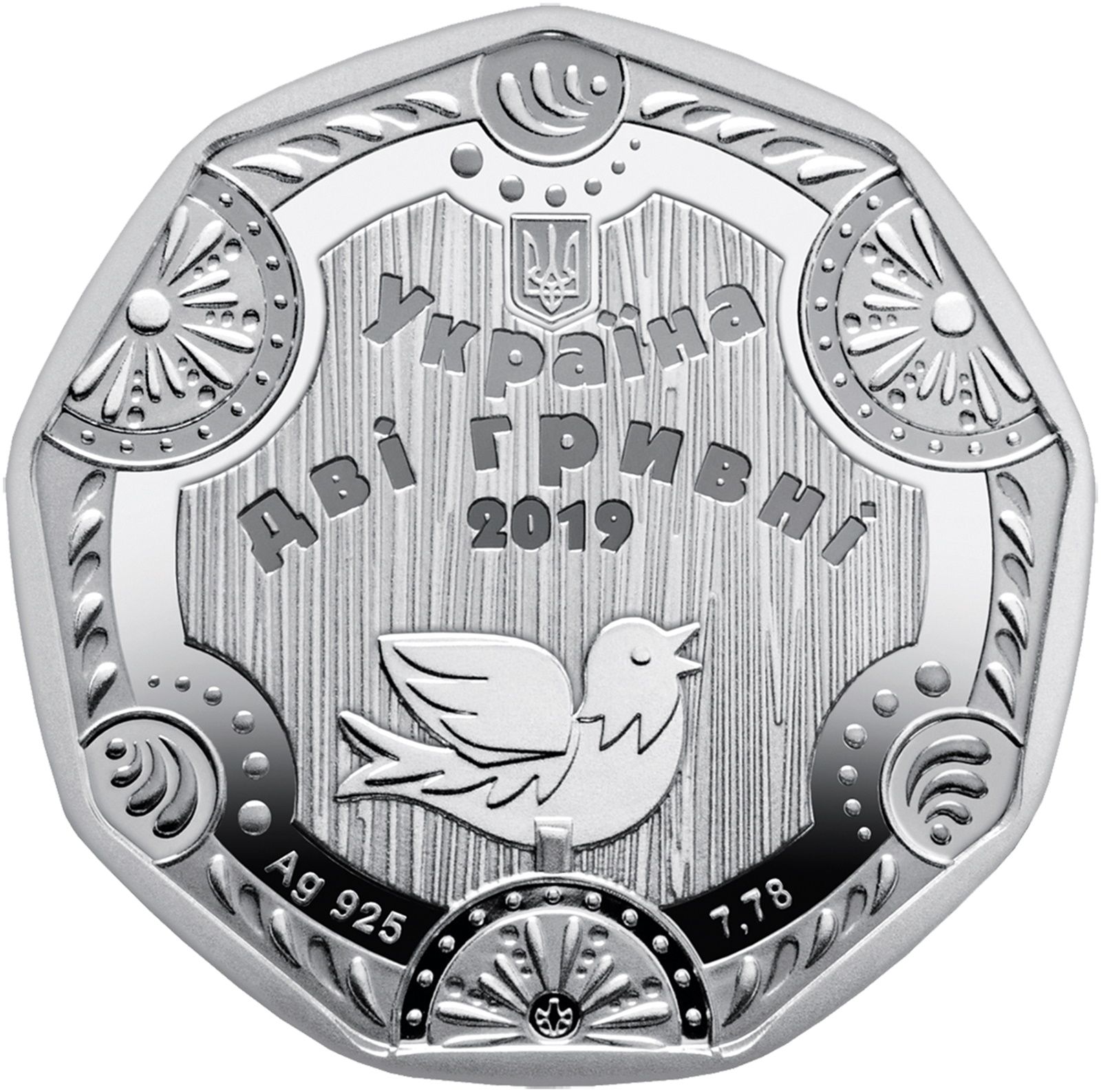 Опис: В оточенні стилізованих елементів, типових для яворівського стилю живопису, зображено малий герб України, під яким розміщено написи УКРАЇНА/ДВІ ГРИВНІ/2019 (Україна/дві гривні/2019) та зображення яворівської іграшкової пташки; нижче, ліворуч, напис Ag 925 (вказує на метал та його пробу); праворуч напис 7,78 (вказує на вагу металу); та також знак монетного двору – Монетний двір НБУ.