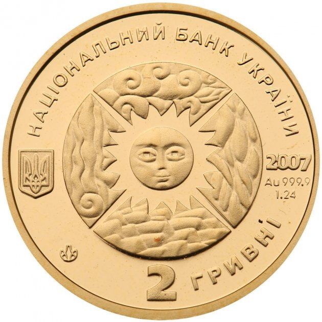 Опис: У центрі монети зображено коло, розділене по діагоналі на сектори, що символізують чотири елементи: землю, повітря, воду, вогонь; у центрі кола — стилізоване зображення Сонця. Ліворуч від кола зображено малий герб України, праворуч — рік випуску: 2007, а також вказано метал, його пробу — Au 999,9, вагу дорогоцінного металу в пробі — 1,24; по колу розміщені написи: НАЦІОНАЛЬНИЙ БАНК УКРАЇНИ (Національний банк України) зверху, 2 ГРИВНІ (2 гривні) знизу та логотип Монетного двору Національного банку України.