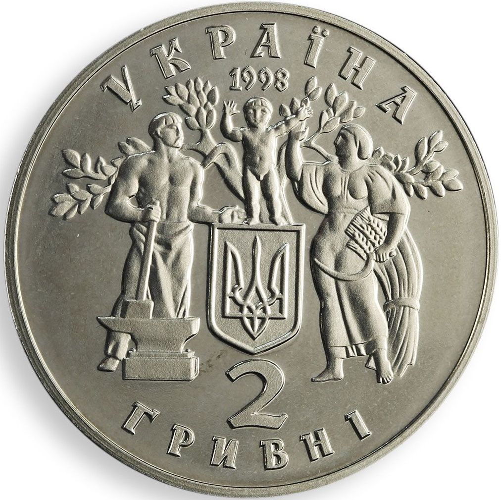 Опис: На монеті зображено малий герб України. Ліворуч і праворуч від герба зображено робітника з молотком біля кузні та селянку з серпом і снопом на тлі крони дерева; вони тримають немовля — символ молодої держави. Ця композиція з трьома фігурами є адаптованою версією графічних робіт Георгія Нарбута. Зверху розміщено дворядковий напис: УКРАЇНА 1998; знизу – дворядковий напис 2 ГРИВНІ.