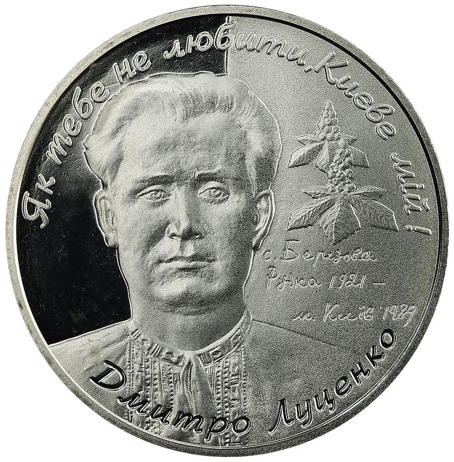 Опис: На монеті зображено портрет Дмитра Луценка, праворуч від якого розташовані дві каштанові суцвіття та стилізовані написи: с. Березова Рудка 1921 — Київ 1989 (Березова Рудка 1921 — Київ 1989); по колу монети викарбувано: ЯК ТЕБЕ НЕ ЛЮБИТИ, КИЄВЕ МІЙ! (Не можна не любити тебе, мій Києві !) (зверху), ДМИТРО ЛУЦЕНКО (Дмитро Луценко) (знизу)
