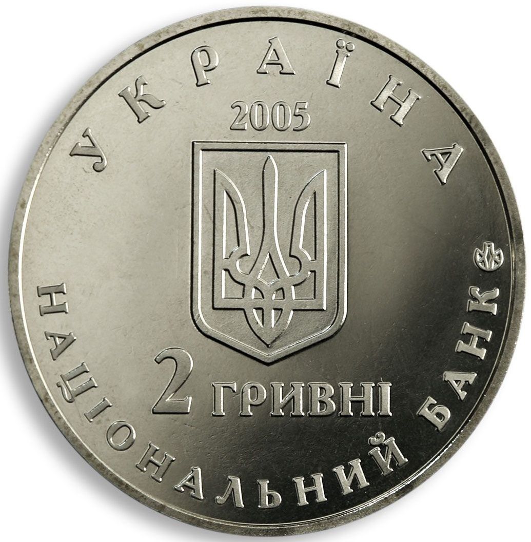 Опис: На монеті зображено малий Державний герб України, над яким розміщено 2005 — рік випуску монети, під ним — 2 ГРИВНІ (2/ гривні), а також написи по колу монети: УКРАЇНА (Україна) (зверху), НАЦІОНАЛЬНИЙ БАНК (Національний банк) (знизу) та логотип Монетного двору Національного банку України.