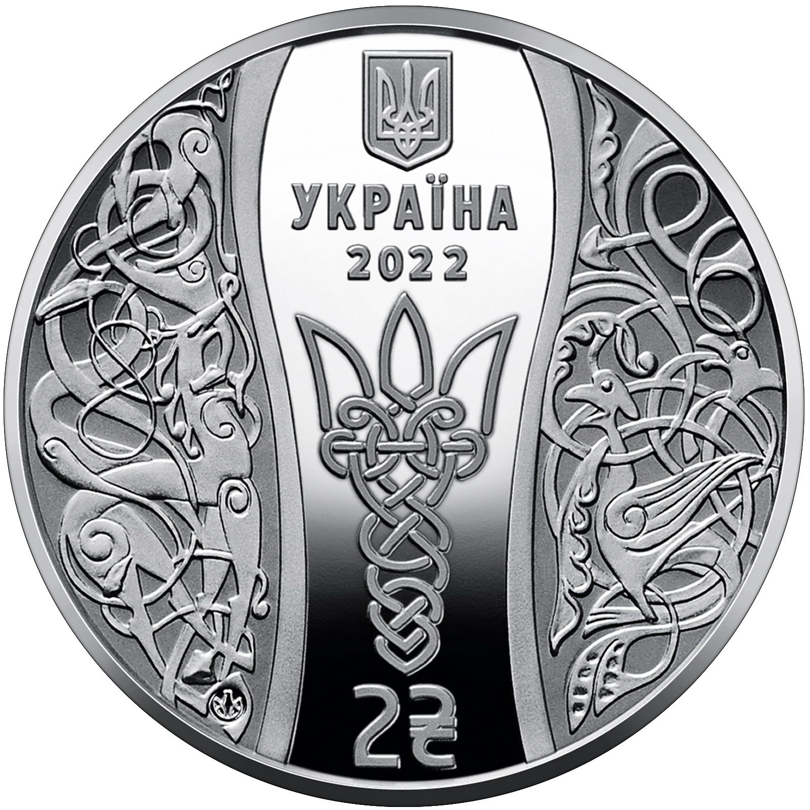 Опис: У верхній частині на дзеркальному тлі — малий Державний герб України; у центрі — орнамент із переплетеним тризубом, що прикрашає залізну сокиру з інкрустацією, датовану X—XIII століттями, праворуч і ліворуч — стилізовані орнаменти, типові для середньовічної Скандинавії та Київської держави, що підкреслюють тісні відносини та контакти між державними утвореннями; написи: UKRAINE/2022 (під гербом), номінал монети - 2 та графічний символ гривні (внизу); логотип Банкнотно-монетного двору Національного банку (зліва на тлі орнаменту).