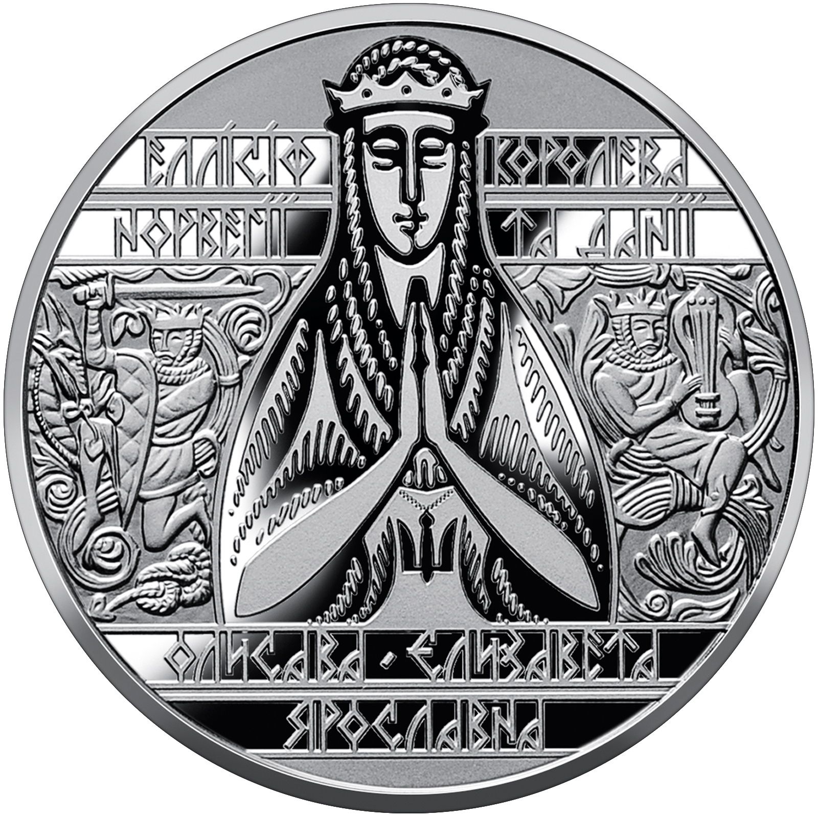 Опис: Стилізоване зображення Єлизавети Ярославни на тлі декоративного фриза, виконаного в стилі скандинавської різьби по дереву та каменю, із сценами, що ілюструють військові та поетичні таланти її чоловіка Гаральда Суворого; є написи, що імітують стародавнє скандинавське рунічне письмо: ELLISIF QUEEN / NORWAY AND DENMARK (по обидва боки зображення Єлизавети), OLISOVA ELIZABETH / YAROSLAVNAYA (знизу).