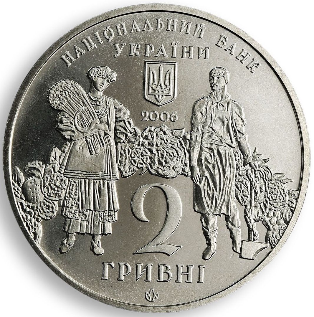 Опис: Зображено фрагмент банкноти 1918 року — селянка та робітник на тлі гірлянди з квітів та фруктів, над якою розміщено рік випуску — 2006, малий герб України та напівкруглий напис: НАЦІОНАЛЬНИЙ БАНК УКРАЇНИ; нижче: 2/ ГРИВНІ (2 / гривні) та логотип Монетного двору Національного банку України.