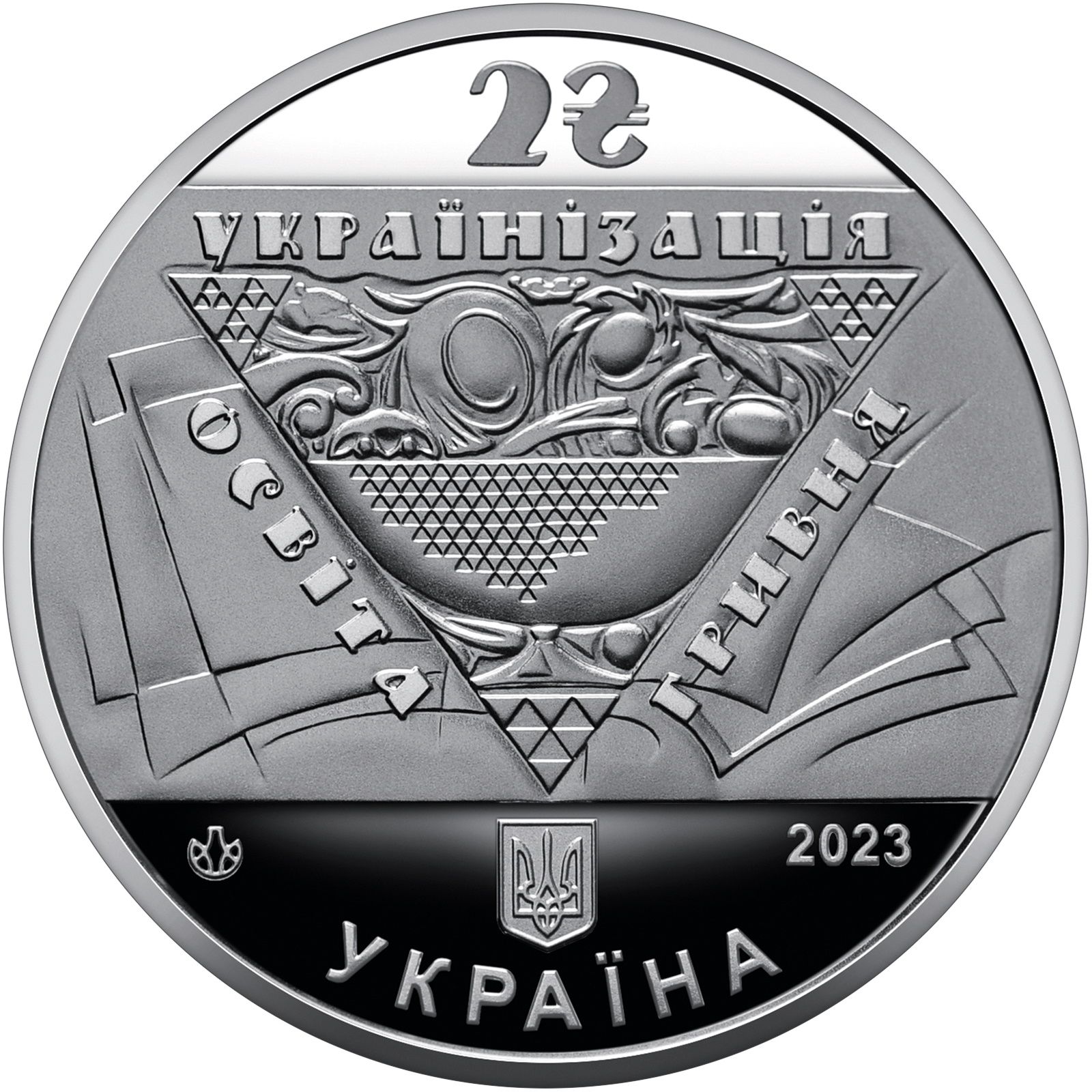 Опис: На дзеркальному тлі внизу — малий герб України та напис «УКРАЇНА», праворуч — рік карбування монети 2023, у центрі, на тлі стилізованого візерунка прапорів — трикутник (віньєтка Георгія Нарбута), що символізує певне культурне та економічне процвітання Української держави за часів Скоропадського гетьманства, який обрамлює написи: УКРАЇНІЗАЦІЯ (зверху), ОСВІТА, ГРИВНЯ (з обох боків); у верхній частині на дзеркальному тлі – номінал 2 та графічний знак гривні; нижче – логотип Банкнотно-монетного двору Національного банку України (зліва).
