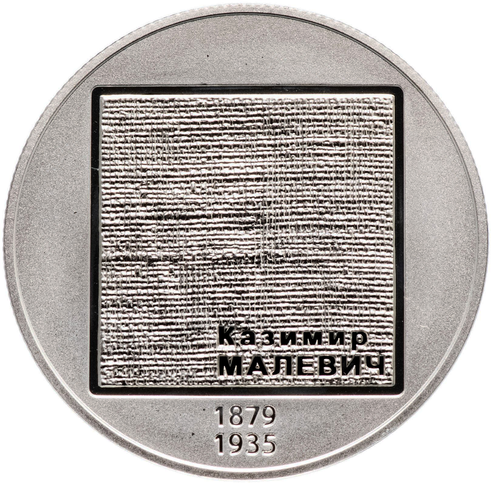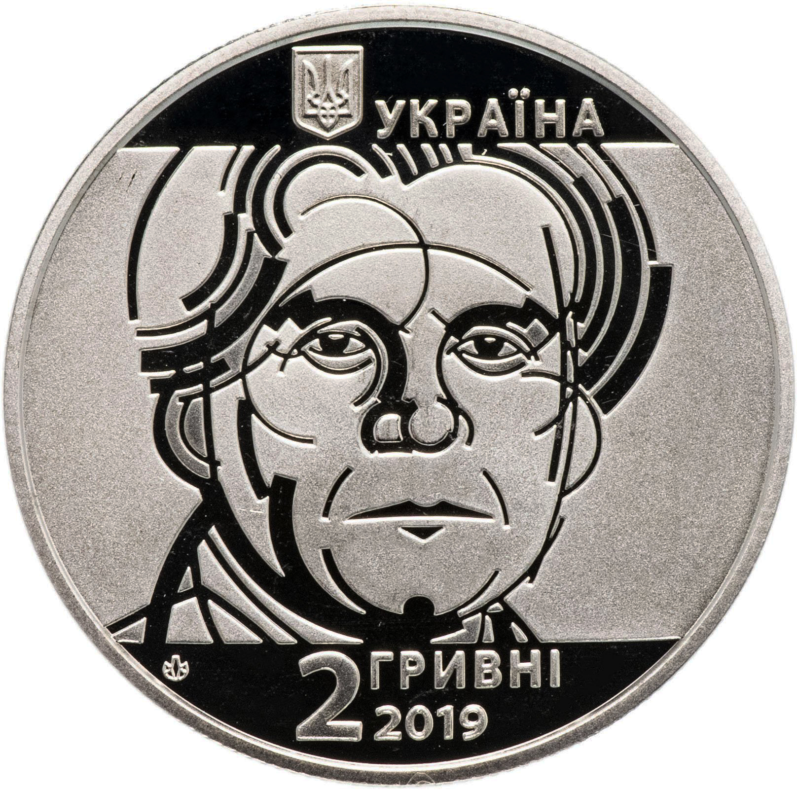 Опис: На гладкому тлі зверху зображено малий герб України з написом «УКРАЇНА» праворуч; на матовому тлі — портрет Казимира Малевича; знизу — напис «2 ГРИВНІ/2019»; під портретом ліворуч – знак монетного двору ДП «Держдрукарня та монетний двір НБУ».
