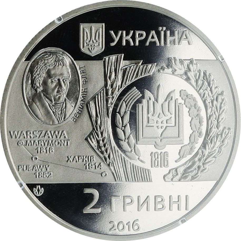 Опис: Зверху зображено малий герб України та напис «УКРАЇНА»; у центрі на гладкому тлі — логотип Харківського національного аграрного університету імені О. Докучаєва, ліворуч від якого — портрет першого директора Маримонтського аграрного інституту Беньяміна Флата та назви міст, де працював університет; внизу – номінал монети ДВІ ГРИВНІ (2 гривні), рік випуску монети 2016 та знак монетного двору НБУ «Держмонетбанк».