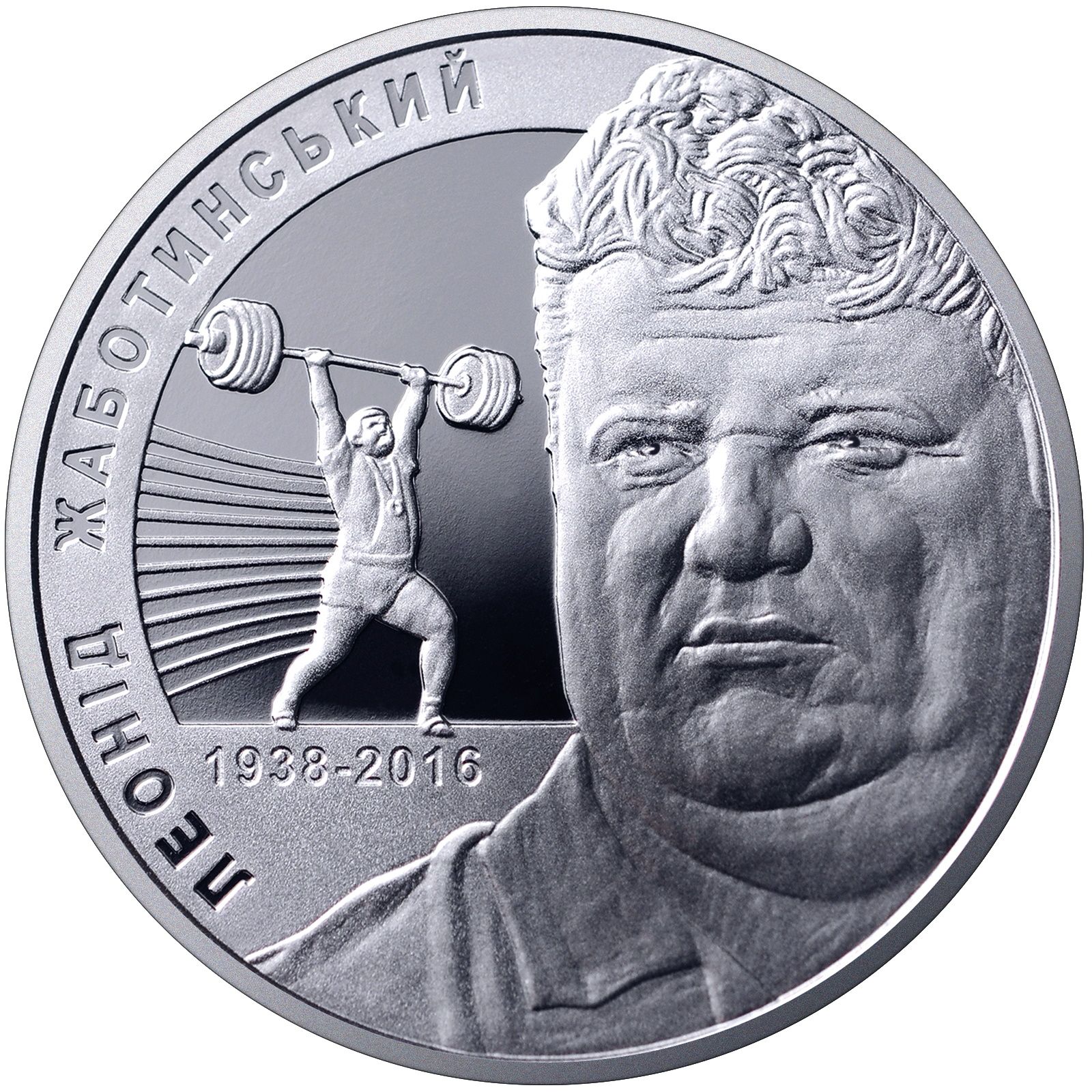 Опис: Зверху, на рельєфному тлі, зображено малий герб України, під яким розміщено напис «УКРАЇНА»; поруч із штангою стоїть постать переможця з піднятими руками; ліворуч, на гладкому тлі, зображено стилізоване табло з олімпійськими та світовими рекордами спортсмена; праворуч — рік випуску монети та її номінал — 2018/2/ГРИВНІ (2018/2/гривні) та знак монетного двору ПБН «Банкнотно-монетний двір» (внизу).