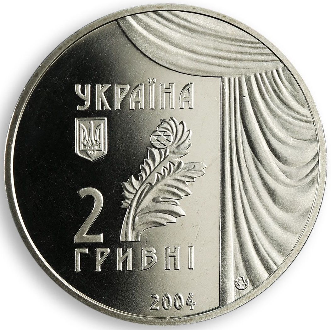 Опис: На гладкому тлі зображено невеликий Державний герб України та написи: УКРАЇНА (Україна) (вгорі) та 2 ГРИВНІ (2 гривні) / 2004 (внизу); у центрі зображено стилізовану квітку; праворуч ця композиція обрамлена сценічною завісою. На аверсі монети також розміщено логотип Монетного двору Національного банку України.