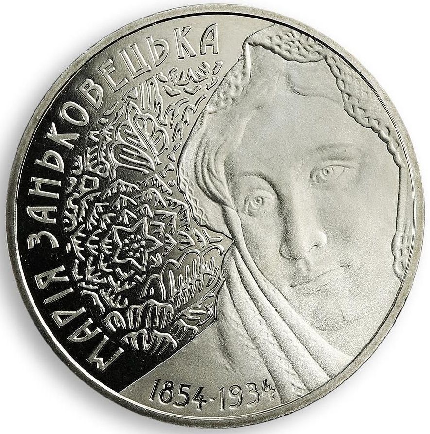 Опис: На передньому плані зображено портрет Марії Заньковецької; на задньому плані — стилізований квітковий орнамент; ліворуч по колу — напис: МАРІЯ ЗАНЬКОВЕЦЬКА, а нижче — 1854-1934, роки її життя.