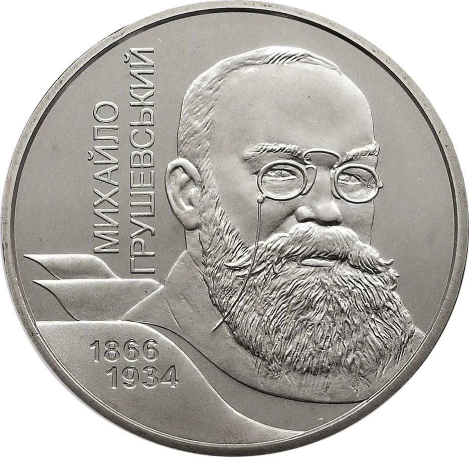 Опис: На монеті зображено портрет Михайла Грушевського, ліворуч — вертикальний напис: МИХАЙЛО/ ГРУШЕВСЬКИЙ (Михайло Грушевський), нижче — роки життя: 1866/ 1934.