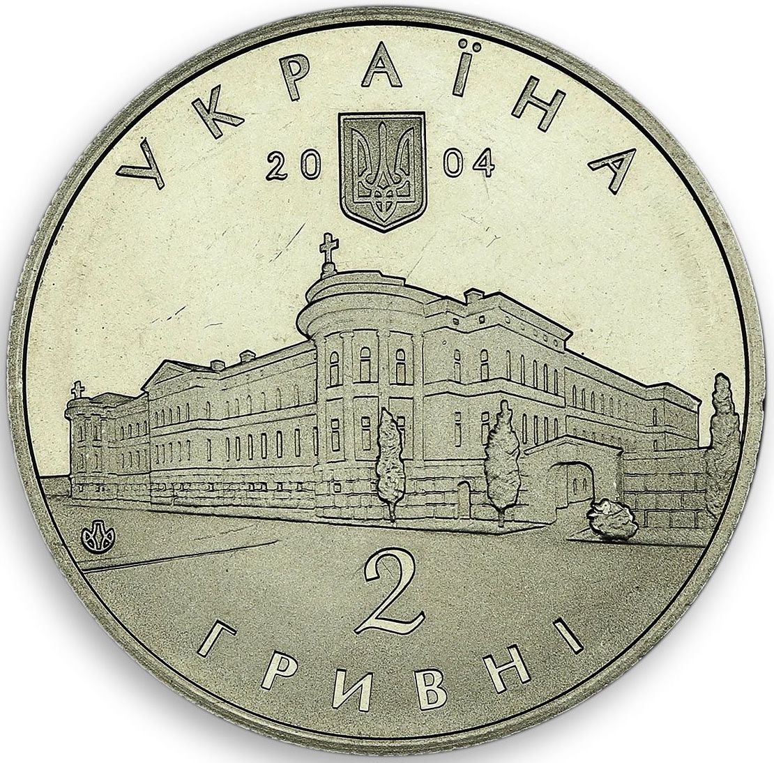 Опис: На монеті зображено будівлю університету (з боку Ботанічного саду), а також написи: зверху — напівкруглий напис «УКРАЇНА», під яким — малий герб України та рік випуску монети — 2004. Внизу - номінал монети: 2/ГРИВНІ (2 гривні) та логотип Монетного двору Національного банку України.