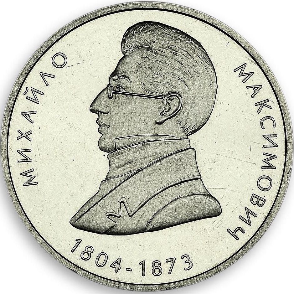 Опис: На монеті зображено профіль Максимовича та наступні написи: МИХАЙЛО (Михайло) (зліва) — з обох боків та півколом; МАКСИМОВИЧ (Максимович) (праворуч) та нижче — 1804 — 1873, роки його життя.