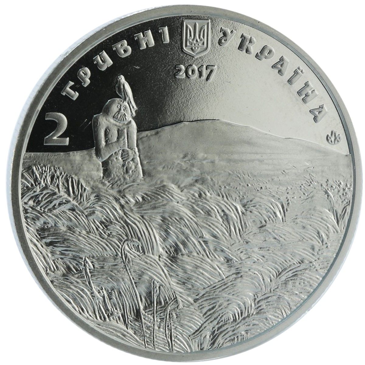 Опис: В українській степу є курган і баба (стела кургану), на плечі якої сидить сокіл; зверху — напівкругла композиція: номінал монети 2 ГРИВНІ (2 гривні), малий герб України (під яким — рік випуску монети 2017), напис УКРАЇНА та знак монетного двору НБУ «Держдрукарня та монетний двір НБУ».
