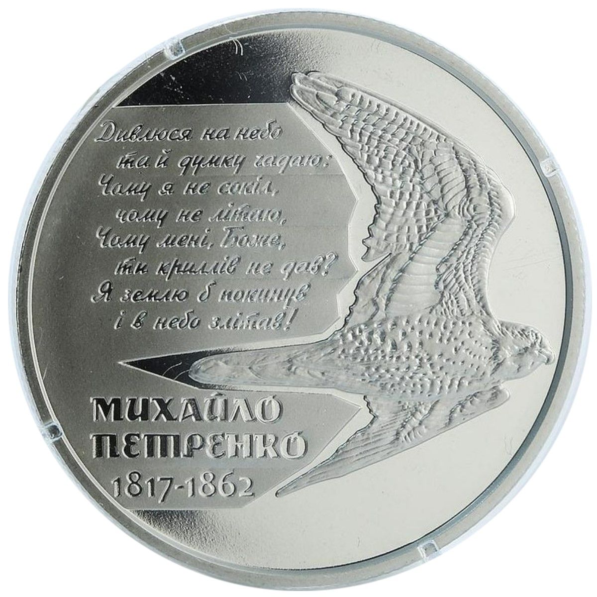 Опис: На гладкому тлі зображено літаючого сокола та такі написи: Я дивлюся на високе небо/і це змушує мене замислитися/Чому я не сокіл?/Чому я не літаю/Боже, чому ти залишив мене/без крил, щоб літати?/Я злетів би з землі/і полетів би високо вгору і МИХАЙЛО/ ПЕТРЕНКО (Михайло/Петренко)/ 1817 - 1862 (внизу).