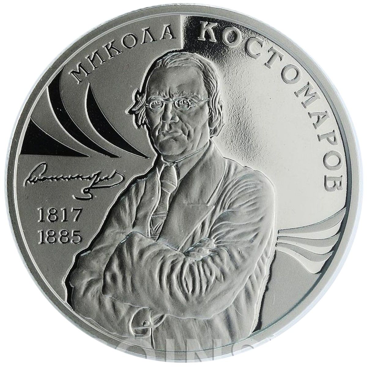 Опис: На монеті зображено портрет Миколи Костомарова, ліворуч від якого — підпис автора та роки його народження і смерті: 1817/1885; зверху — напівкругла легенда МИКОЛА КОСТОМАРОВ.