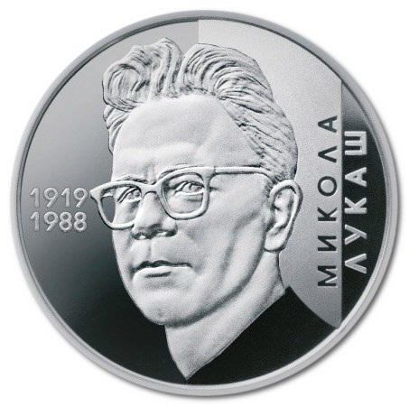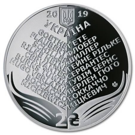 Опис: Вгорі, праворуч і ліворуч розташовані цифри 20 і 19 відповідно, між ними — малий герб України; під гербом — напис «УКРАЇНА»; нижче — номінал монети — 2 ₴; стилізована композиція із книгою перекладів Миколи Лукаша з такими авторами: ҐЕТЕ/ ФЛОБЕР/ ШИЛЛЕР/ ГЕЙНЕ РІЛЬКЕ/ СЕРВАНТЕС/ БЕРНС ТУВІМ/ ГЮГО ВЕРЛЕН/ БОККАЧЧО/ МІЦКЕВИЧ (зліва, на матовому тлі). Праворуч, на гладкому тлі, зображено: СЕРВАНТЕС/ ТУВІМ БЕРНС/ ВЕРЛЕН ГЮГО/ БОККАЧЧО/ МІЦКЕВИЧ. СЕРВАНТЕС/ТУВІМ БЕРНС/ ВЕРЛЕН ГЮГО/ БОККАЧЧО/ МІЦКЕВИЧ (праворуч, на гладкому тлі). Праворуч на гладкому тлі розміщено знак монетного двору НБУ «Банкнотно-монетний двір НБУ».