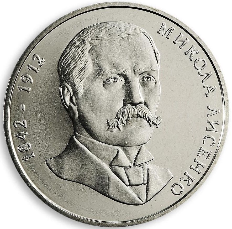 Опис: На монеті зображено портрет Миколи Лисенка; по колу монети розміщені написи: МИКОЛА ЛИСЕНКО (праворуч) та 1842 - 1912, роки його життя (ліворуч).