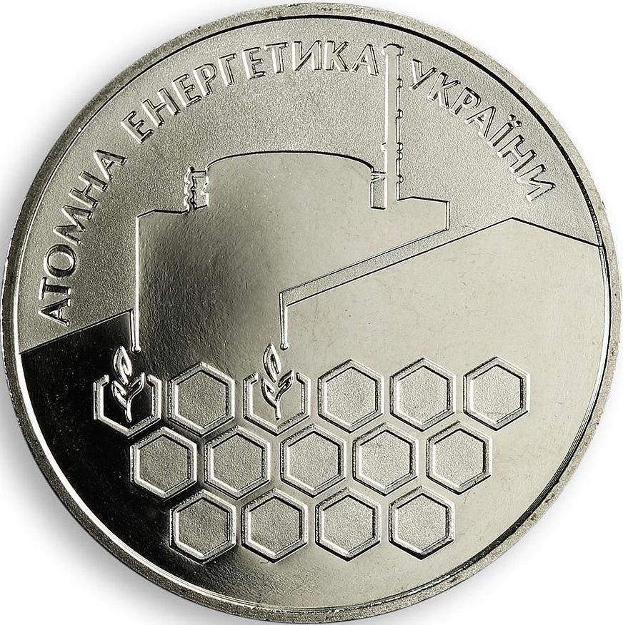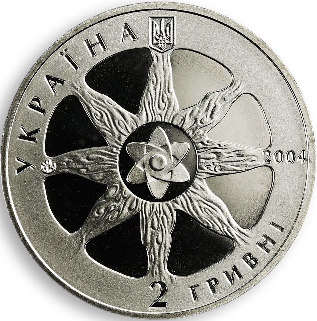 Опис: На монеті зображено символічне вогняне колесо, що символізує рух і технічний прогрес. Атомна енергія слугує двигуном, розміщеним у центрі колеса. На тлі колеса по його периметру розміщено невеликий герб України (вгорі) та написи: 2 ГРИВНІ (2 гривні) (внизу), УКРАЇНА, 2004 (2004 (Україна/ 2004), рік випуску монети та логотип Монетного двору Національного банку України.