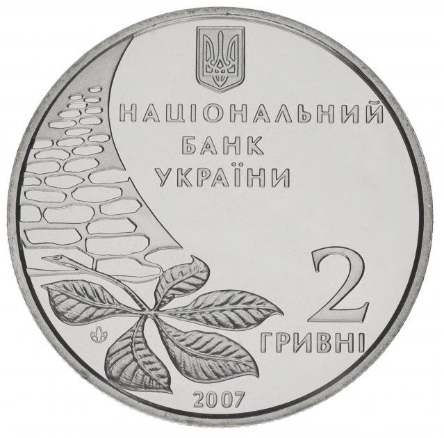Опис: На скляному тлі зображено: зверху — малий герб України, під ним — напис НАЦІОНАЛЬНИЙ / БАНК / УКРАЇНИ (Національний банк України), праворуч внизу — 2 / ГРИВНІ (2 гривні), номінал монети, нижче - рік карбування: 2007, ліворуч - зображення каштанового листка, що впав на бруківку, та логотип Монетного двору Національного банку України.