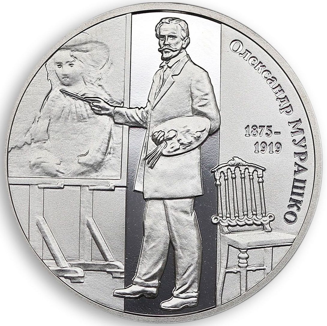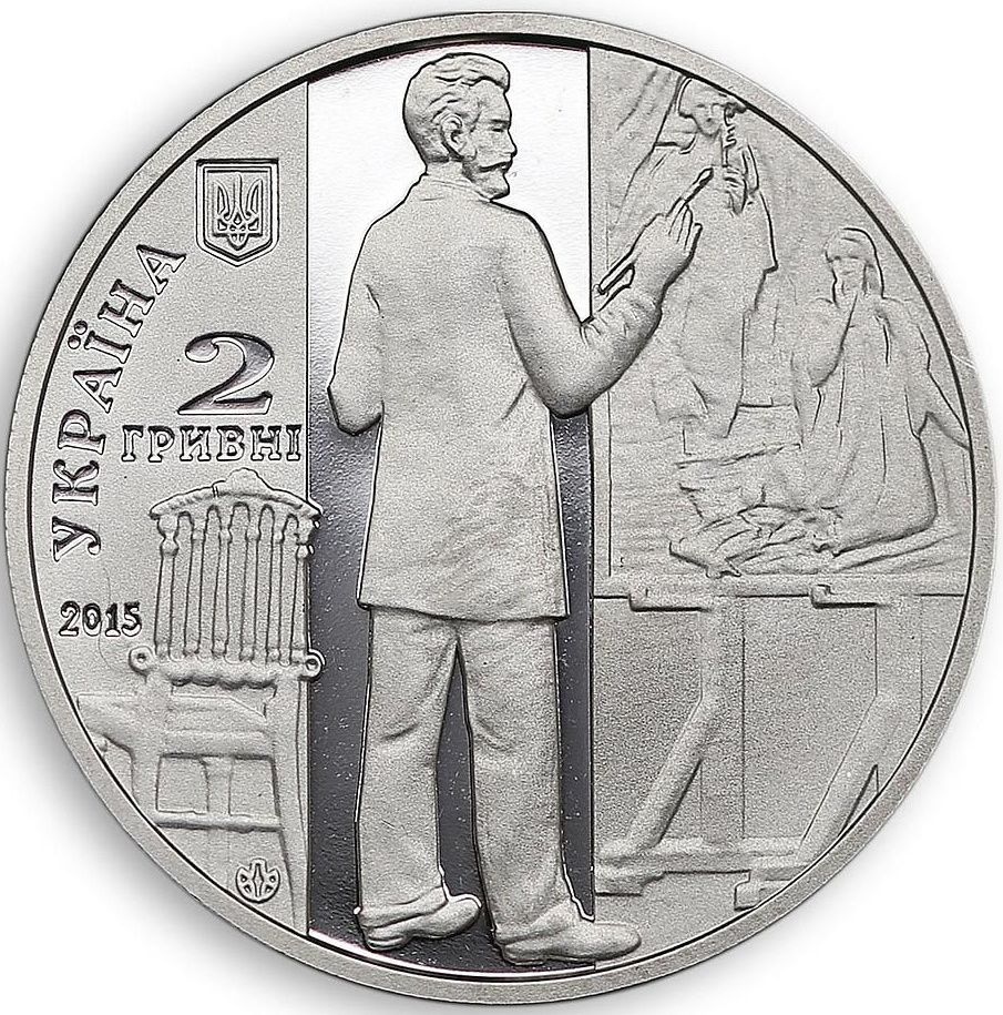 Опис: Зліва зображено малий герб України, під яким розміщено номінал 2/ГРИВНІ (2/гривні), напис УКРАЇНА у формі чаші, рік випуску — 2015 та знак Монетного двору Національного банку України (внизу); у центрі – стилізована композиція: Олександр Мурашко в процесі написання картини «Благовіщення» у своїй майстерні.