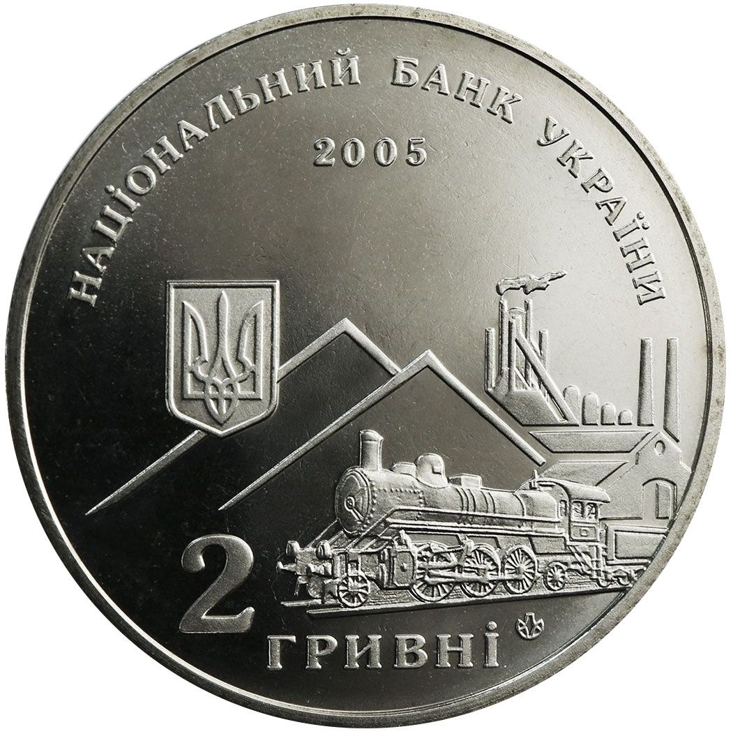 Опис: На тлі стилізованих контурів відвалів, доменної печі та відкритої печі зображено паровоз (як символ прогресу кінця 19 століття); також зображено: малий Державний герб України (зліва), круговий напис: НАЦІОНАЛЬНИЙ БАНК УКРАЇНИ (Національний банк України) (зверху), 2005, рік випуску монети (знизу), 2 ГРИВНІ (2/ гривні) та логотип Монетного двору НБУ.