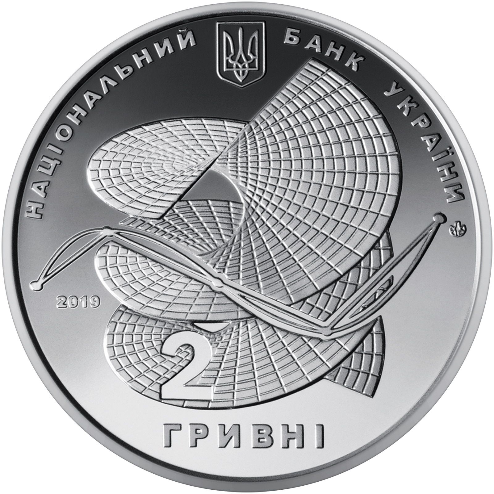 Опис: У верхній частині розміщено малий герб України, оточений написом НАЦІОНАЛЬНИЙ (Національний) (зліва), БАНК УКРАЇНИ (Банк України) (праворуч); у центрі на гладкому тлі стилізована композиція, що зображує гелікоїд (гвинтову поверхню) на задньому плані та багатокутне наближення кривої і номінал монети 2 на передньому плані; внизу розміщено напис ГРИВНІ; ліворуч — рік карбування монети 2019; праворуч – знак монетного двору ДП «Держдрукарня та монетний двір НБУ».