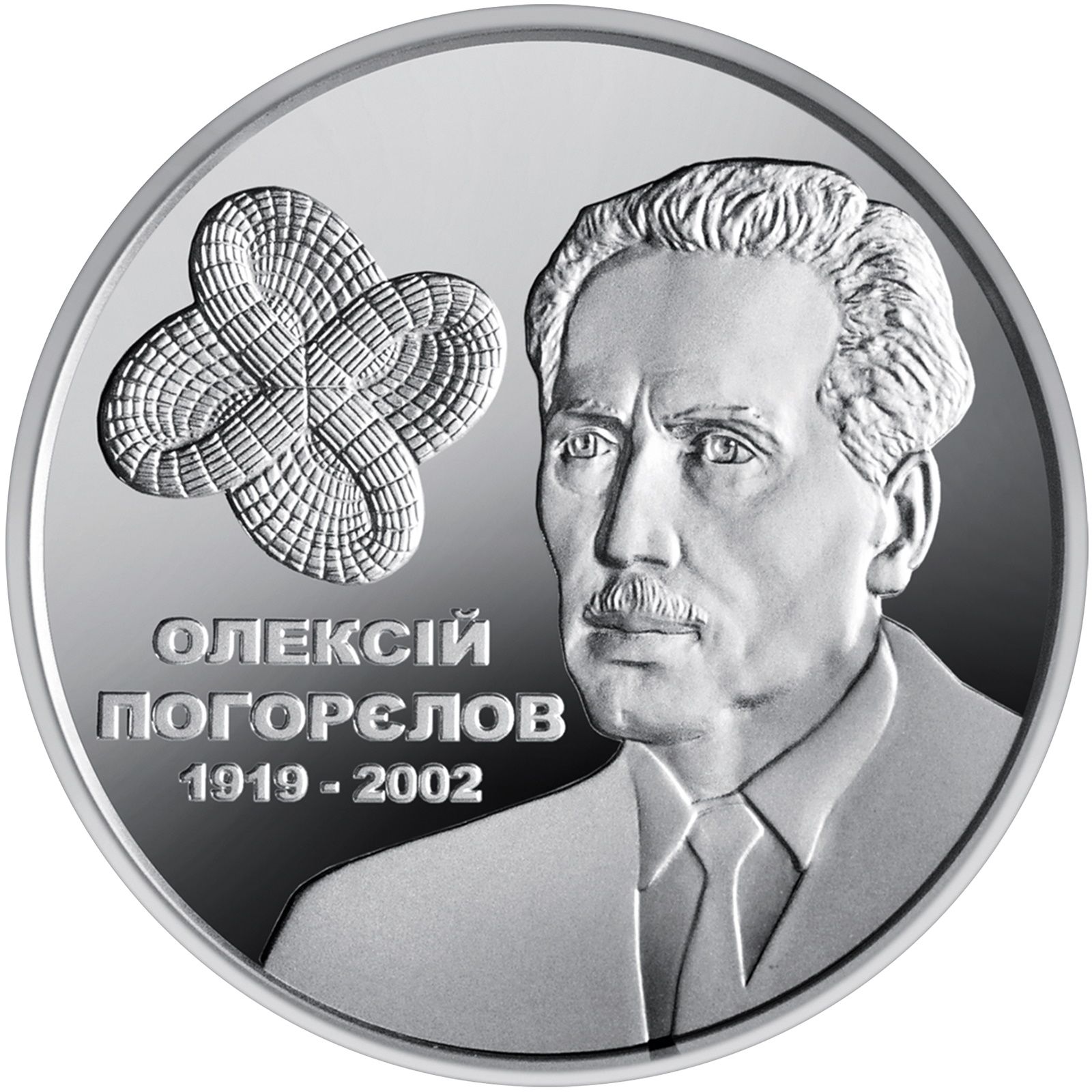 Опис: Портрет Олексія Похорілова розміщений на гладкому тлі; ліворуч від нього — абстрактна форма, що символізує топологічні дослідження математика в геометрії.