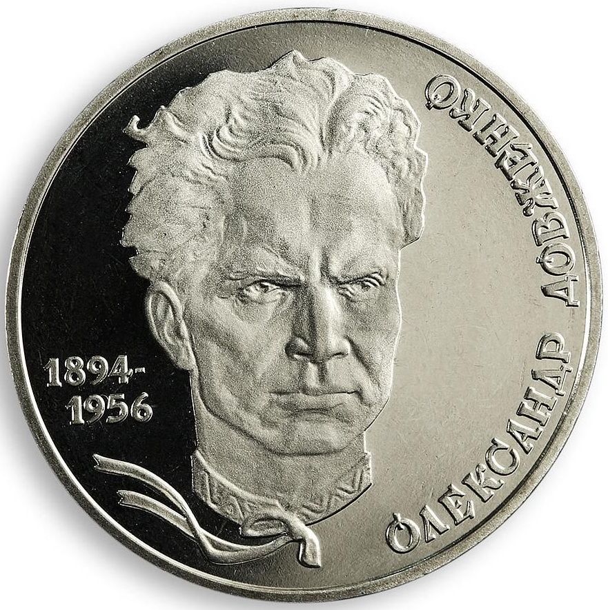 Опис: На монеті зображено портрет Олександра Довженка, а також написи: праворуч — 1894-1956, роки його життя; ліворуч півколом — ОЛЕКСАНДР ДОВЖЕНКО (Олександр Довженко).