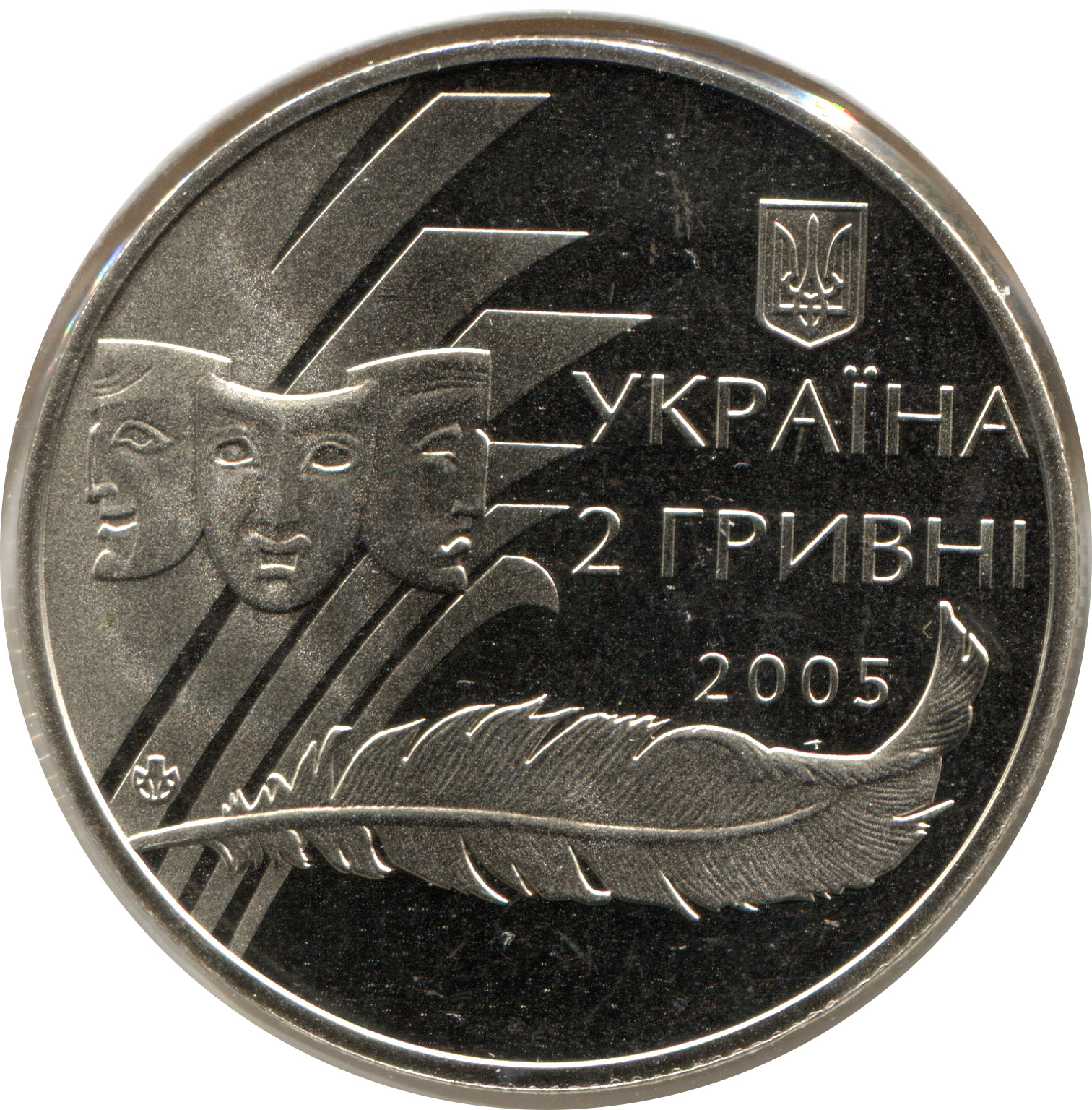 Опис: Зліва на тлі стилізованих аркушів паперу зображено театральні маски — символи драматичного мистецтва, під ними — стилізована ручка та логотип Монетного двору Національного банку України, зверху та праворуч — малий Державний герб України, під яким розміщено напис: УКРАЇНА/ 2/ГРИВНІ/2005 (Україна/ 2 / гривні /2005).