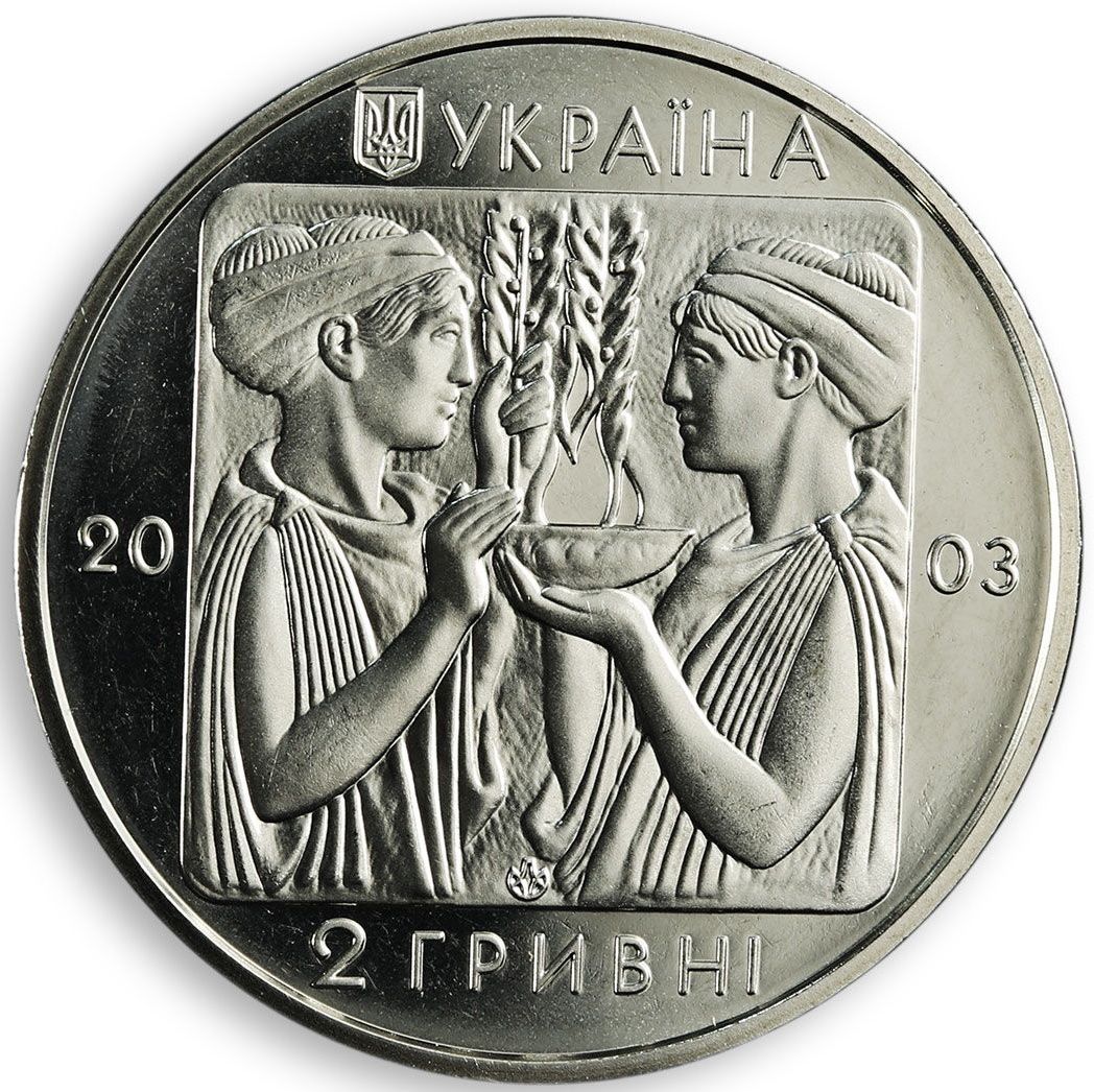 Опис: Алегорична сцена відкриття Олімпійських ігор: дві жіночі фігури, одягнені в туніки, тримають чашу з полум'ям і лавровими гілками, символом миру. Над площею вигравірувано невеликий Державний герб України та написи: УКРАЇНА (Україна) (зверху), 2 ГРИВНІ (2/ гривні) (знизу), 2003 (зліва).