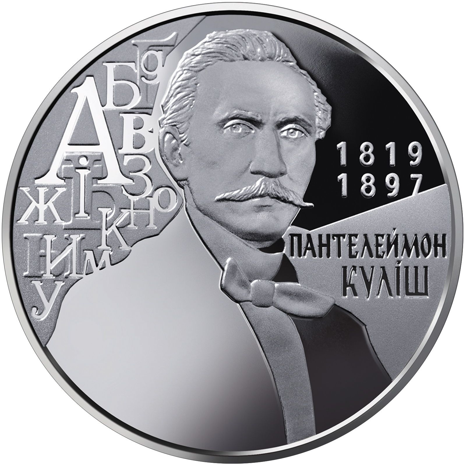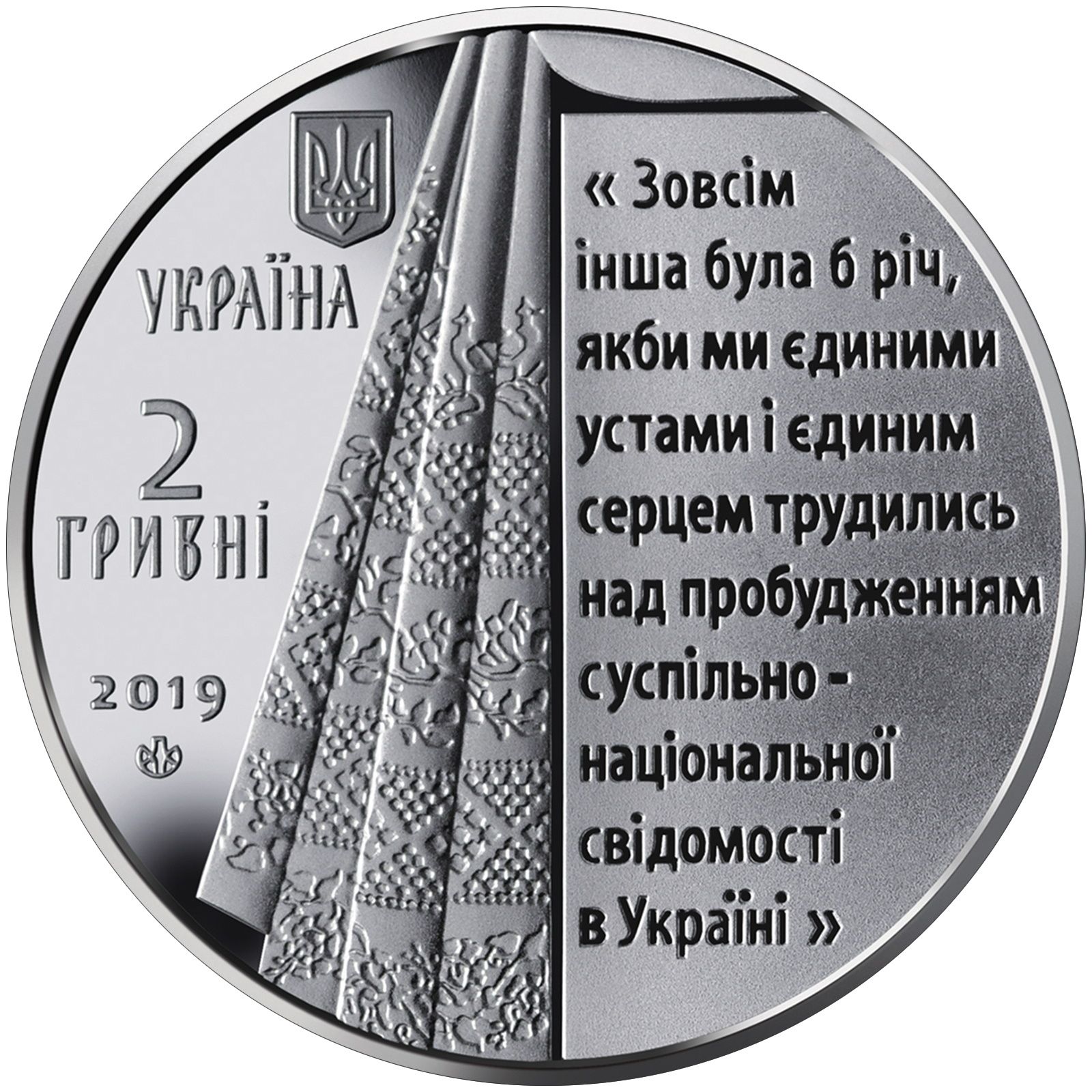 Опис: Вгорі ліворуч — малий герб України. Внизу ліворуч на гладкому тлі — напис «УКРАЇНА/2/ГРИВНІ/2019»; внизу — знак монетного двору НБУ «Банкнотно-монетний двір НБУ». Праворуч зображено вишитий рушник та цитату з листа Куліша до його дружини Ганни Барвінок: ЗОВСІМ/ ІНША БУЛА Б РІЧ,/ ЯКБИ МИ ЄДИНИМИ/ УСТАМИ І ЄДИНИМ/ СЕРЦЕМ ТРУДИЛИСЬ/ НАД ПРОБУДЖЕННЯМ/ СУСПІЛЬНО-/ НАЦІОНАЛЬНОЇ/ СВІДОМОСТІ/ В УКРАЇНІ (Було б радикальним покращенням, якби ми об’єднали наші думки та серця, щоб пробудити народ України до його соціальної та національної ідентичності).