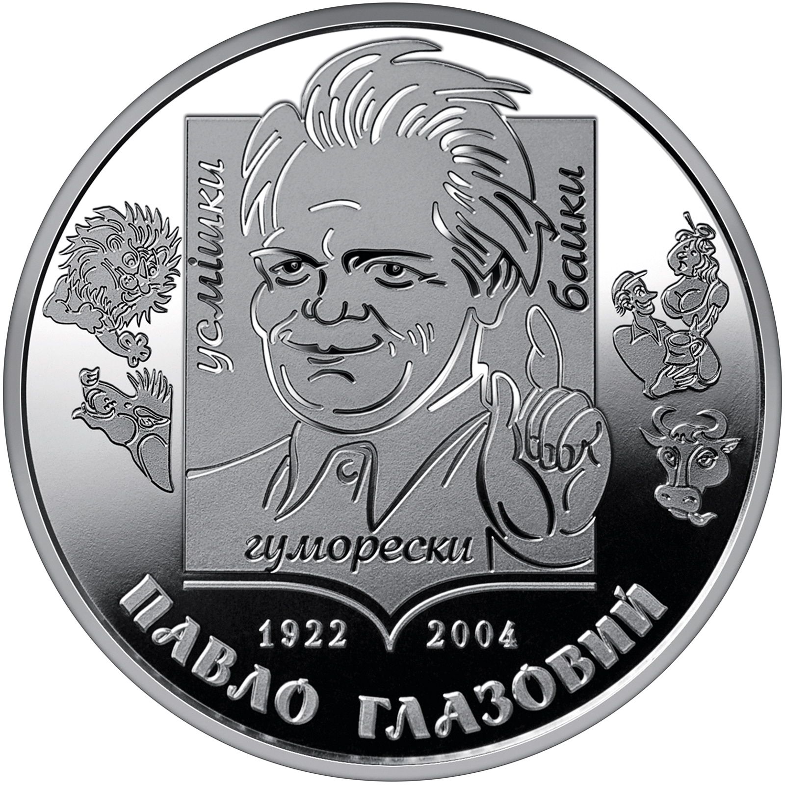 Опис: Стилізована книга, виконана в мультяшному стилі, є портретом гумориста; портрет оточений такими підписами: УСМІШК (вертикально, ліворуч), БАЙКИ (вертикально, праворуч) і ГУМОРЕСКИ (під портретом); ліворуч і праворуч, на гладкому тлі, зображені персонажі гумористичних творів Глазового; нижче вказані роки його народження і смерті – 1922 2004, а також напівкругла легенда ПАВЛО ГЛАЗОВИЙ.