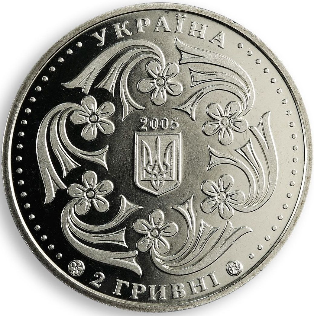 Опис: Є напівкруглі написи: УКРАЇНА (Україна) (вгорі), 2 ГРИВНІ (2 / гривні) та логотип Монетного двору Національного банку України (внизу); у рамці з бісерним колом розміщено композицію, що символізує український танець — квіти зі стрічками, посередині яких розміщено малий Державний герб України, над яким вказано рік випуску монети — 2005.