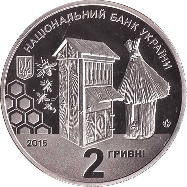 Опис: Зверху розміщено напівкруглий напис НАЦІОНАЛЬНИЙ БАНК УКРАЇНИ; ліворуч — Малий герб України; зображено таку стилізовану композицію: у центрі — рамковий вулик Петра Прокоповича з бджолами, що вилітають з нього, старовинний вулик і бджолині стільники (ліворуч); внизу на матовому тлі викарбувано номінал - 2 ГРИВНІ, ліворуч - легенда 2015 (рік випуску монети); праворуч на блискучій поверхні - знак Монетного двору Національного банку України.
