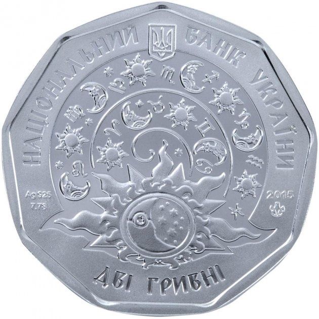 Опис: Зверху розміщено малий герб України з напівкруглим написом НАЦІОНАЛЬНИЙ БАНК УКРАЇНИ; знизу — номінал монети ДВІ ГРИВНІ та стилізований композиційний елемент — на тлі зоряного неба зображено знаки зодіаку, місяць і сонце; праворуч розміщено позначення року випуску монети 2015 та знак Монетного двору Національного банку України, ліворуч – позначення металу, його проби та ваги Ag 925/7,78.