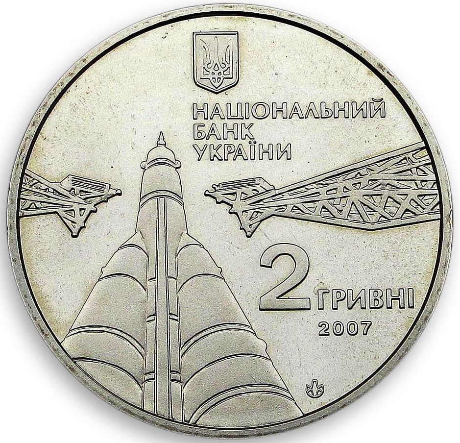 Опис: У верхній частині розміщено малий герб України, під яким знаходиться напис «НАЦІОНАЛЬНИЙ БАНК УКРАЇНИ» та стилізоване зображення космічного ракетоносія перед запуском. Нижче розміщено написи «2 ГРИВНІ / 2007» та логотип Монетного двору Національного банку України.