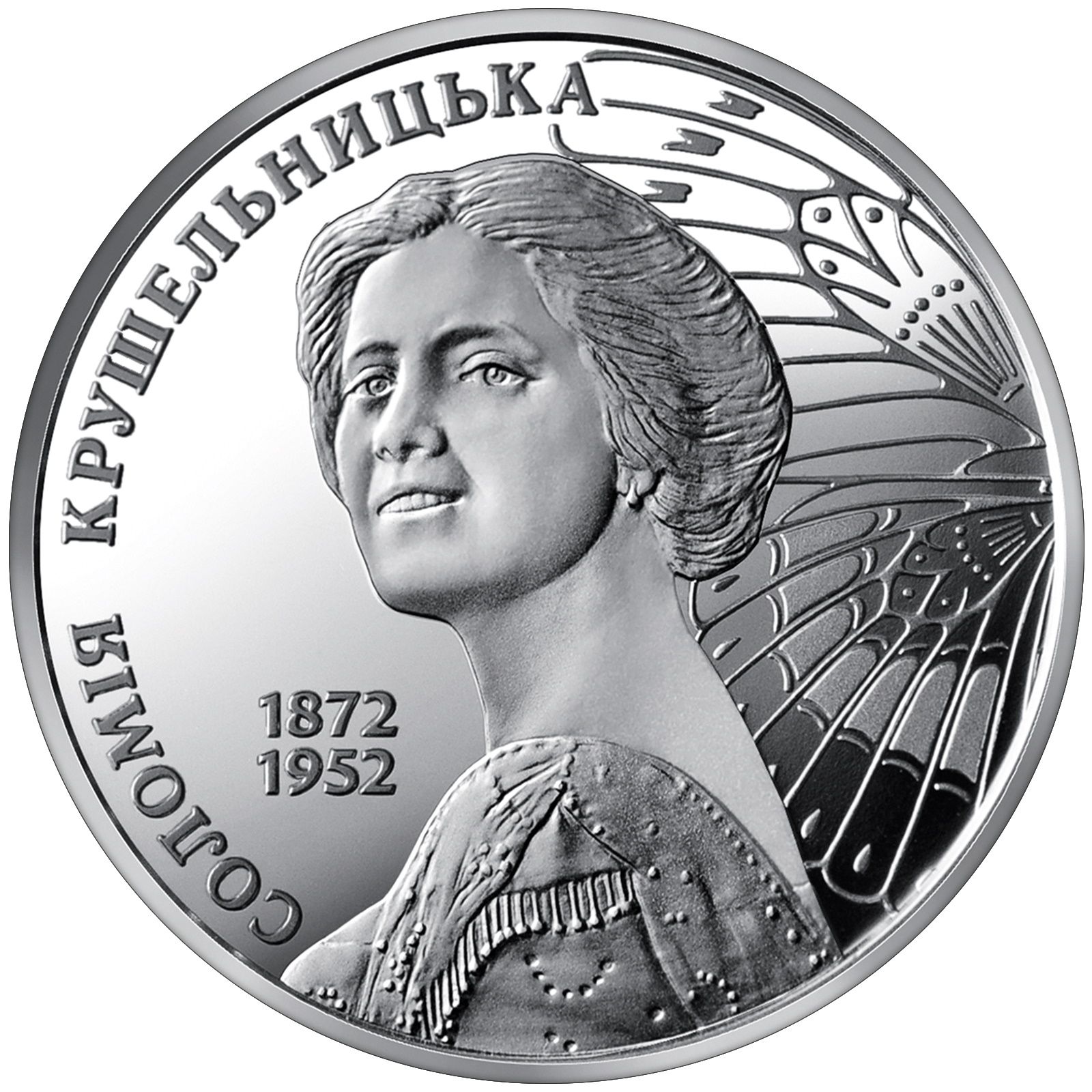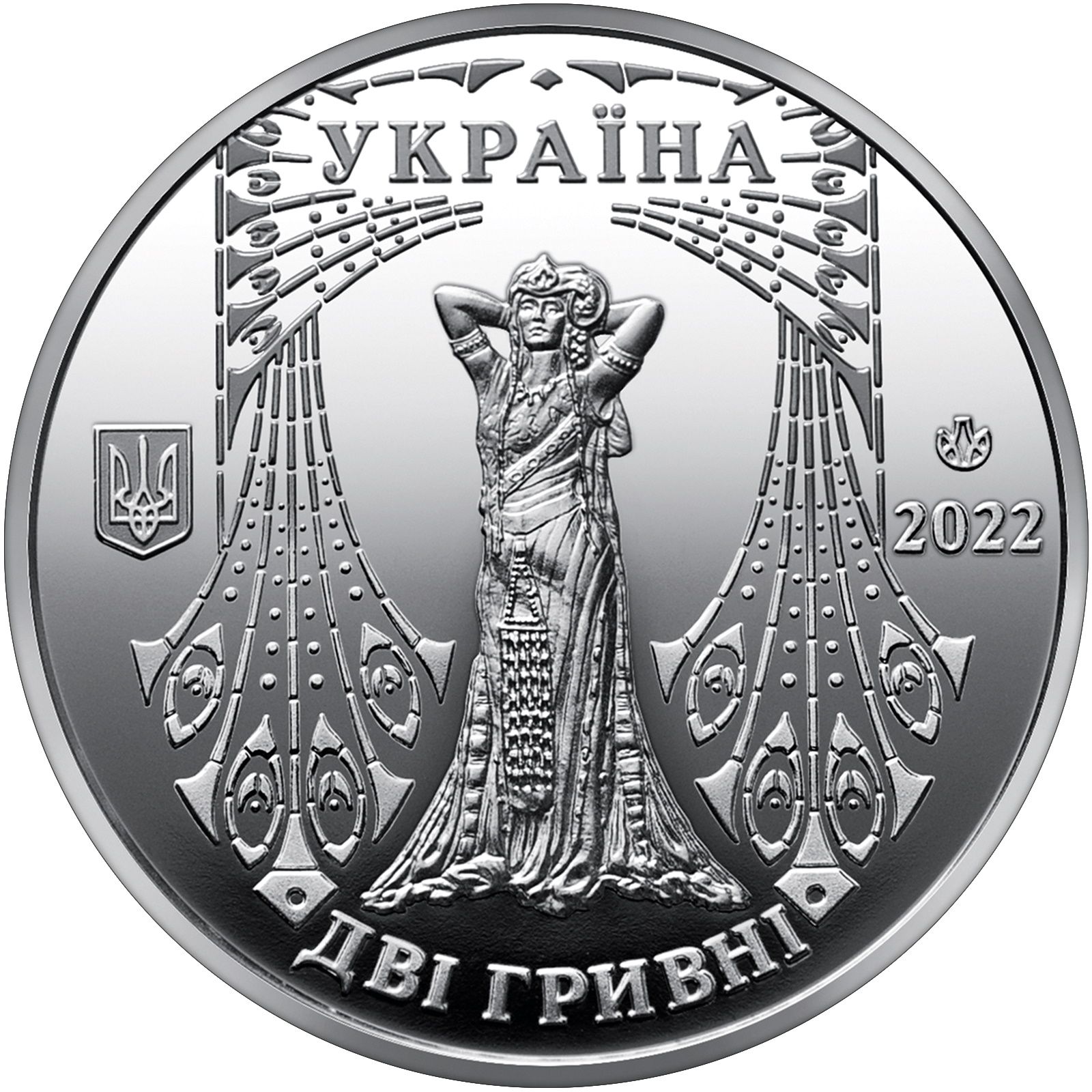 Опис: У центрі зображено Крушельницьку, яка виконує оперу Верді «Аїда»; по обидва боки від Крушельницької — стилізовані сценічні крила, прикрашені декоративними орнаментами; ліворуч — малий герб України; зверху, на тлі декоративного орнаменту, — напис «УКРАЇНА»; праворуч — рік випуску монети — 2022; знизу – номінал монети – ДВІ ГРИВНІ; праворуч, над роком випуску, – знак монетного двору – друкарні та монетного двору НБУ.