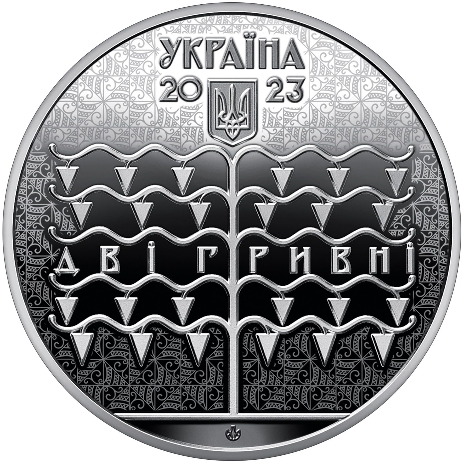 Опис: На тлі орнаменту, розробленого Василем Кричевським, у верхній частині розміщено напис «УКРАЇНА», під яким зображено малий Державний герб України, праворуч і ліворуч від якого — рік випуску 2023, у центрі — стилізоване декоративне «дерево життя» — елемент Державного кредитного квитка Української Народної Республіки, в центрі якого — номінал ДВІ ГРИВНІ; внизу, на дзеркальному тлі, розміщено логотип Банкнотно-монетного двору Національного банку України.