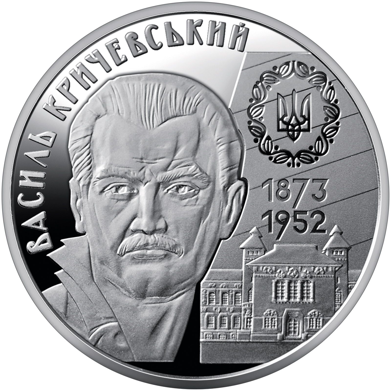 Опис: Портрет Василя Кричевського, праворуч від якого зображено композицію, що символізує його спадщину: у верхній частині — герб Української Народної Республіки, під яким зображено перший зразок нового українського архітектурного стилю — головний фасад будівлі Полтавського губернського земства (1903–1908), побудованої за проектом Кричевського, написи: ВАСИЛЬ КРИЧЕВСЬКИЙ (ліворуч від портрета півколом на дзеркальному тлі), роки життя — 1873/1952 (праворуч від портрета на матовому тлі).