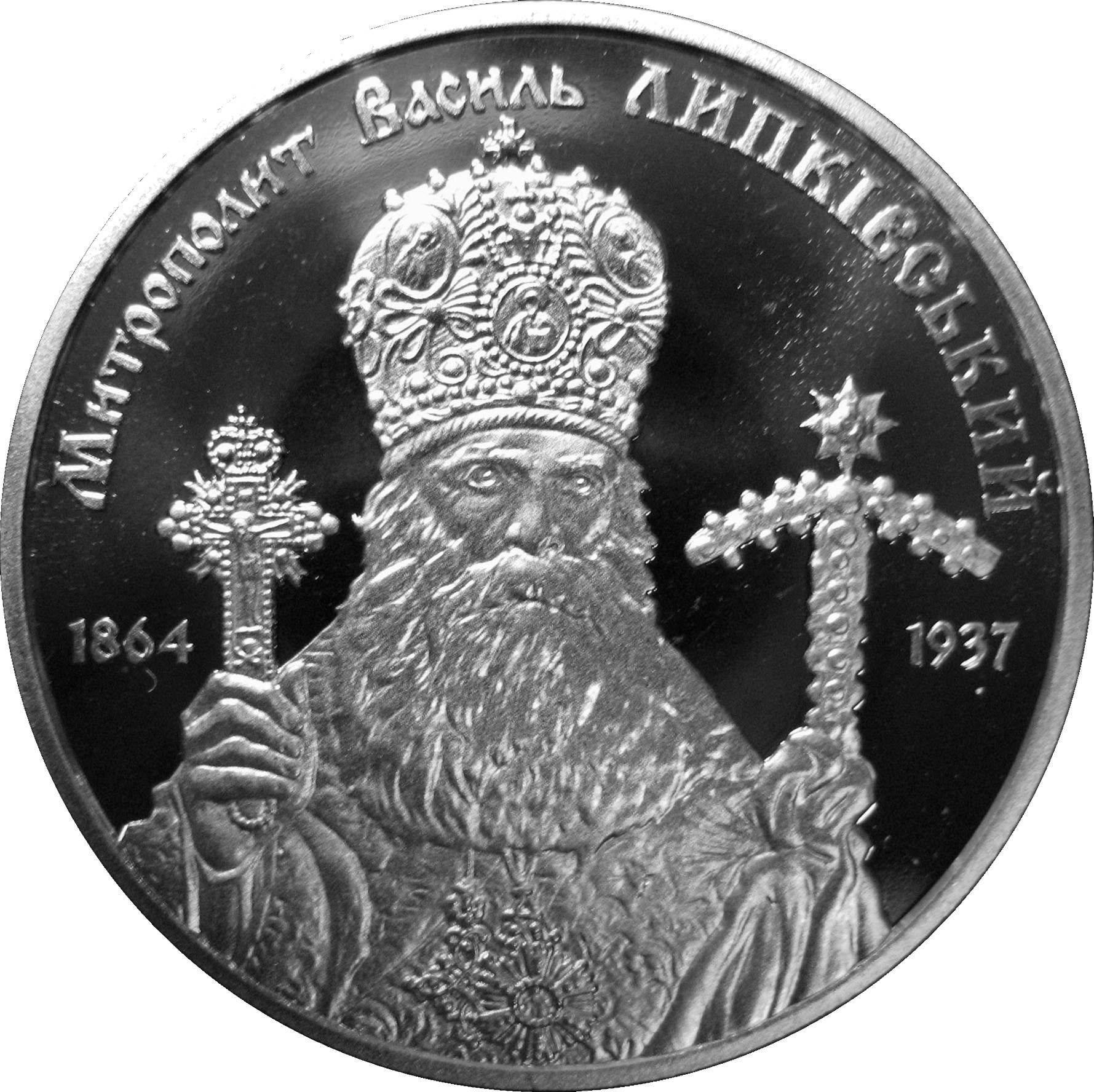 Опис: Зверху розміщено малий герб України з напівкруглим написом «Національний банк України»; у центрі — композиція: в терновому вінці, що символізує трагічну долю Василя Липківського, зображено стилізоване зображення Євангелія на тлі Софійського собору в Києві, настоятелем якого був митрополит, знак Монетного двору Національного банку України (праворуч), позначення року випуску монети 2014 та номінал ДВІ ГРИВНІ (дві гривні) внизу.