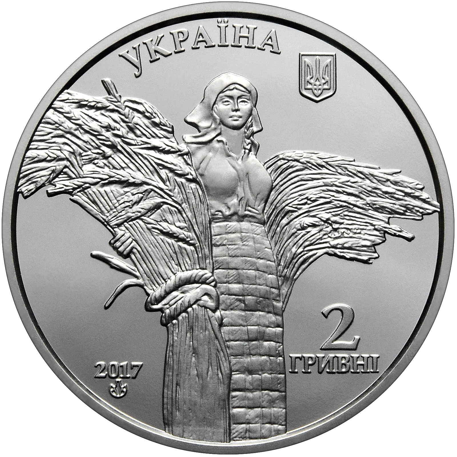 Опис: Зверху розміщено напис «УКРАЇНА» та малий герб України (праворуч); на гладкому тлі зображено жінку, яка тримає снопи пшениці; нижче вказано рік випуску 2017 та знак монетного двору НБУ «Банкнотно-монетний двір» (ліворуч) та номінал 2 /ГРИВНІ (2/гривні) (праворуч).