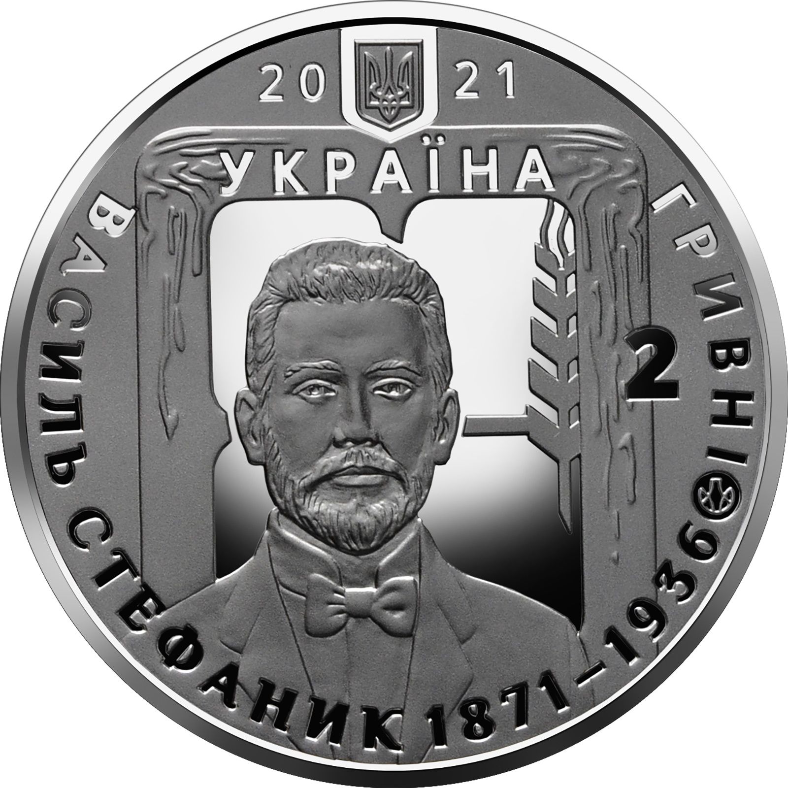 Опис: Зверху зображено малий герб України, по обидва боки якого розміщено цифри 2021; у центрі — така стилізована композиція: на тлі вікна сільської хати — портрет Стефаника, праворуч від якого — колос пшениці, що символізує перо письменника; є такі написи: УКРАЇНА (Україна) (над портретом), 2, номінал монети (праворуч), ГРИВНІ (півколом, праворуч) та ВАСИЛЬ СТЕФАНИК 1871–1936 (півколом, знизу); праворуч, між написами, розміщено знак монетного двору НБУ «Банкнотно-монетний двір НБУ».